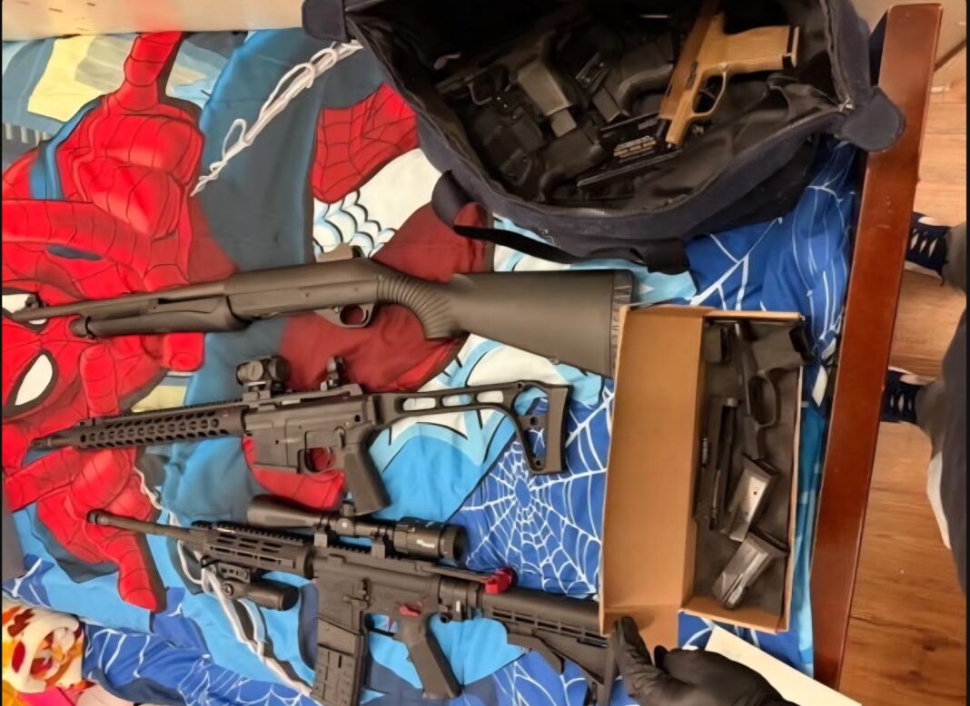 La policía dijo que ejecutaron una orden de registro poco después de las 5 a.m. y encontraron dos rifles semiautomáticos, uno con culata plegable y cargador desmontable, así como al menos cinco pistolas cargadas, incluyendo una encontrada en una cesta de dormitorio con su número de serie eliminado, según documentos judiciales.
