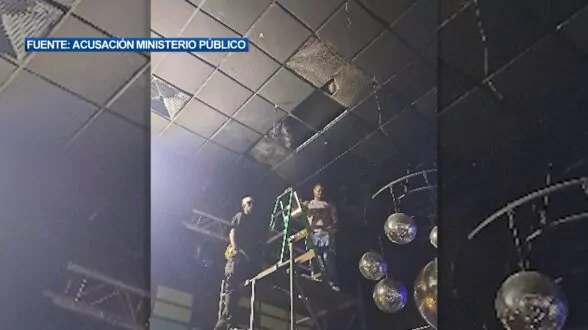 Horas antes de la tragedia, dos hombres fueron captados sobre un andamio con una escalera en el interior de la discoteca Jet Set. Se observa el techo sin al menos seis plafones.