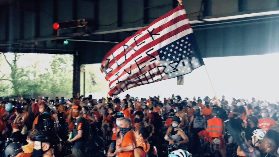 Una manifestación en un puente de Brooklyn durante el día XNUMX de junio.