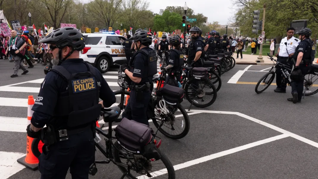 “Algunas personas derribaron el portabicicletas y cruzaron ilegalmente la barrera policial mientras corrían hacia la Escalinata de la Rotonda”, declaró la Policía del Capitolio. “Nuestros agentes bloquearon inmediatamente al grupo y comenzaron a realizar arrestos”.
