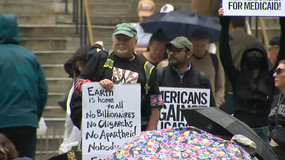 Una gran multitud de manifestantes se ha reunido en Filadelfia, a pesar de la lluvia intermitente.
