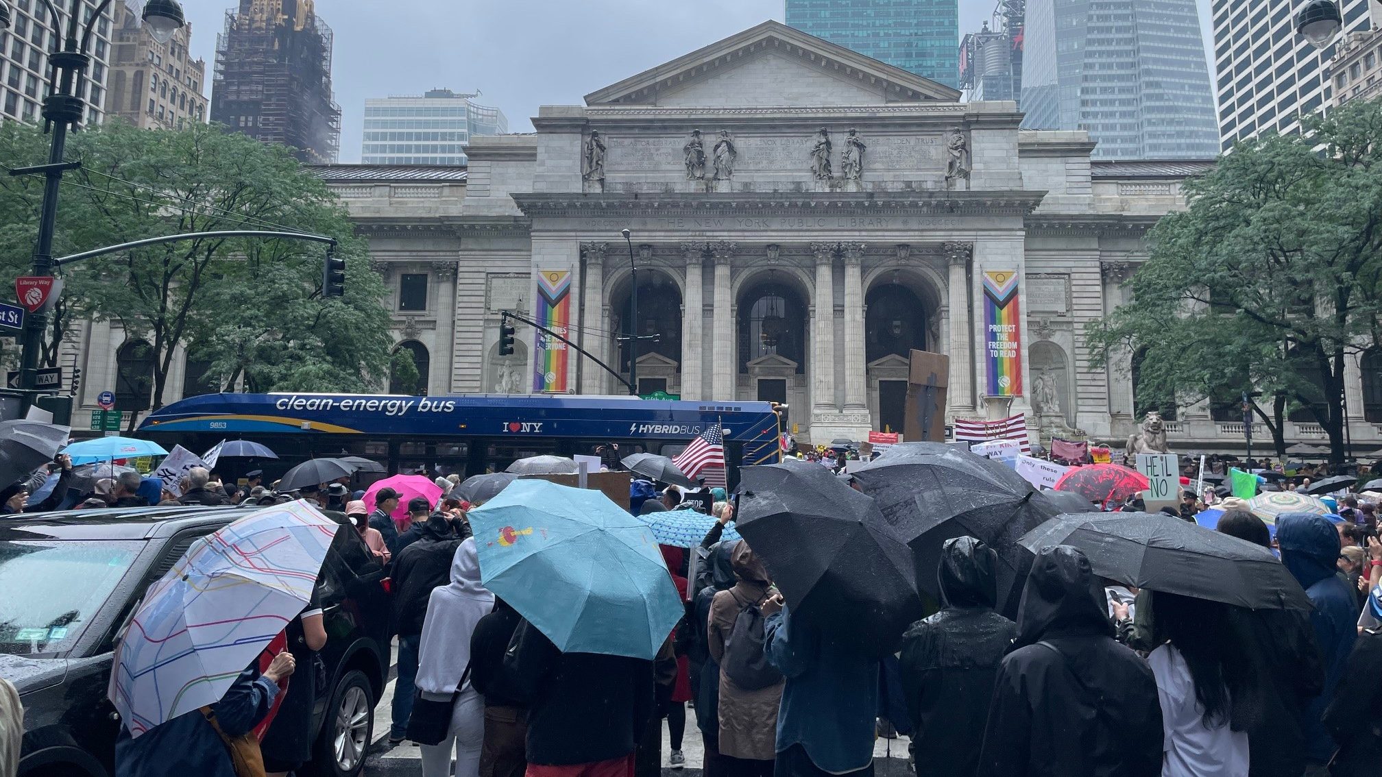 Una multitud enorme se congregó, y sigue creciendo, en el centro de la ciudad cerca de la Biblioteca Pública de la Ciudad de Nueva York, para protestar contra la administración Trump.