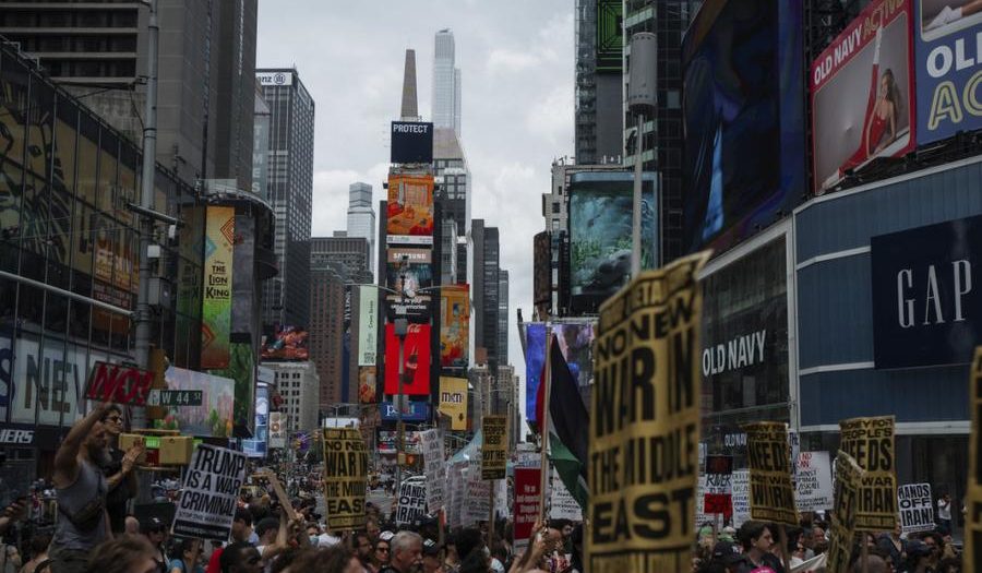 NUEVA YORK.-Estados Unidos presenció el domingo protestas contra la guerra en Nueva York, Washington D. C. y otros lugares del país tras los ataques estadounidenses a tres instalaciones nucleares en Irán hace un día.