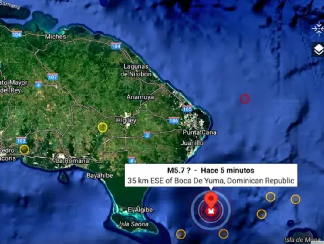 “El sismo de magnitud 5.7 ocurrido hace unos minutos, con epicentro al sur de Punta Cana, al este de la isla Saona y al sureste de Boca de Yuma, se ha sentido fuerte, aunque breve, en todo el este de RD, en Santo Domingo, en Santiago, y en todo Puerto Rico, incluyendo San Juan”.