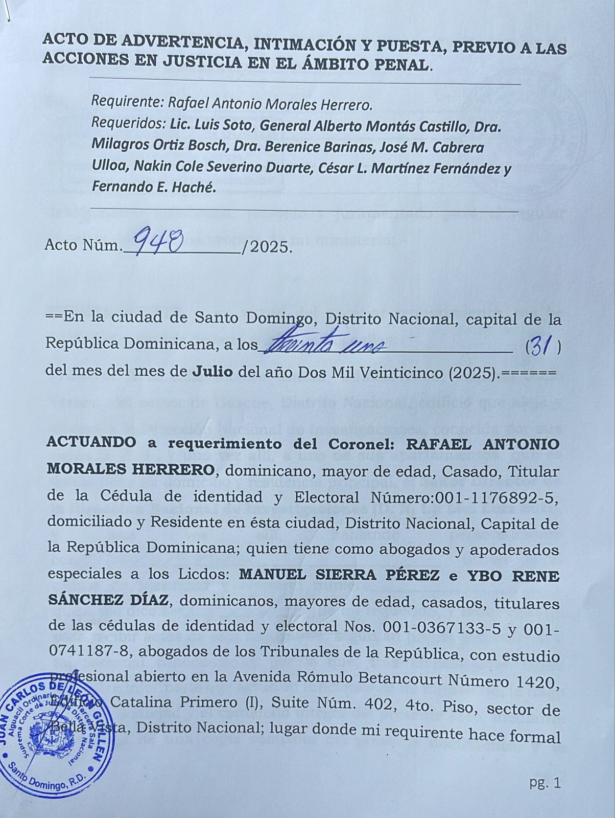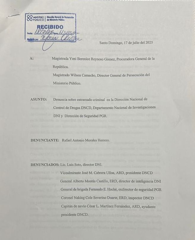 SANTO DOMINGO.-El coronel Rafael Antonio Morales Herrero presento hace varios dias formalmente una denuncia penal contra altos mandos de la Dirección Nacional de Control de Drogas (DNCD), la Dirección Nacional de Inteligencia (DNI) y la Procuraduría General de la República (PGR).