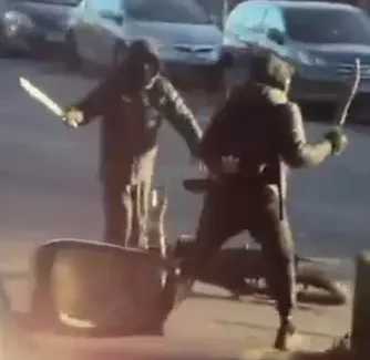 INGLATERRA.-Un impactante vídeo captó el aterrador momento en que tres jóvenes delincuentes enmascarados se enfrentaron en una calle inglesa , blandiendo violentamente machetes de 60 centímetros durante una pelea a plena luz del día.
