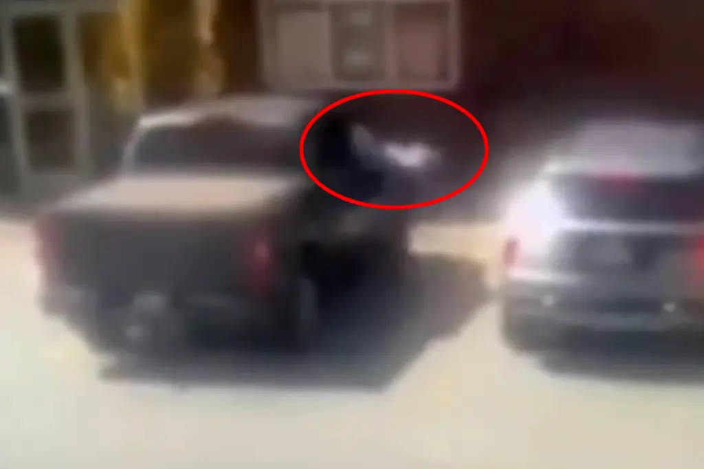 Posteriormente el todo terreno se aleja a toda velocidad y es captado desde distintos ángulos de vigilancia huyendo del estacionamiento.